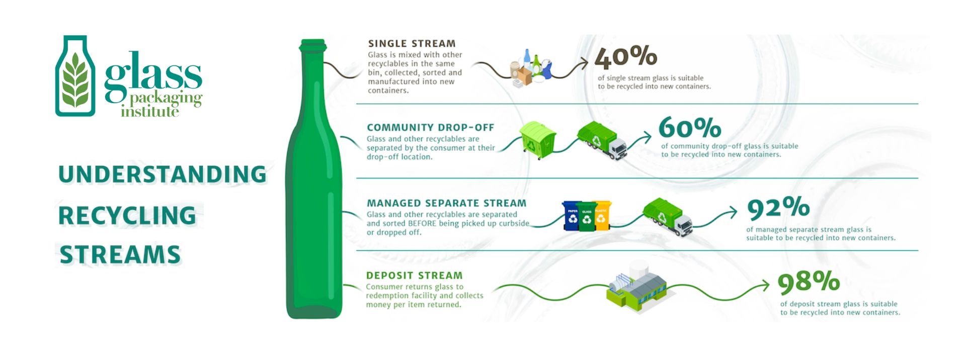 GPI is also boldly working to boost U.S. glass recycling from its current 30% rate to 50% by 2030. Through program and stakeholder partnerships, GPI aims to ensure no bottle is left behind only to end up in landfills. Learn about the glass recycling roadmap here