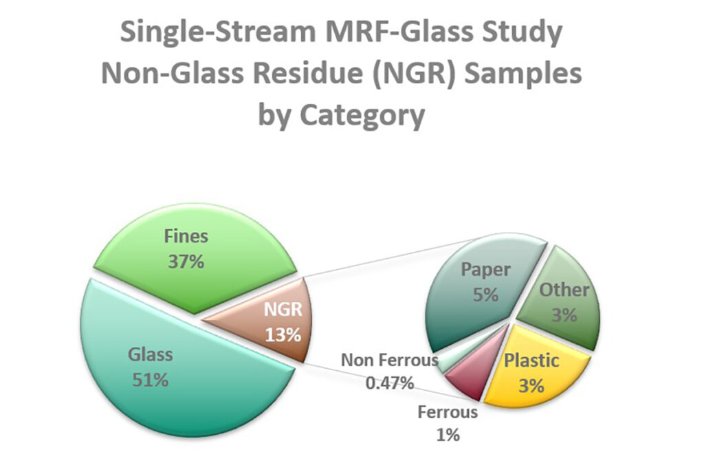 Results from four MRFs in one state found 13% non-glass residue (NGR) by weight in the glass stream, including 5% paper, 3% mixed plastics and less than 1% metals (Figure 1, below). Glass samples from the four MRFs in the second state found almost 20% NGR with a similar commodity breakdown, although with a larger percentage of metals. The data indicates the opportunity by commodity if these items were positively captured before making it to the glass supply chain.